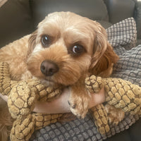 "I wasn’t sure if my small dog would love this little dinosaur, but he carries it everywhere! It’s soft, well-made, and the squeaker isn’t too loud (thankfully). I love that it’s made with durable materials — it feels so much better than the cheap toys from big box stores."